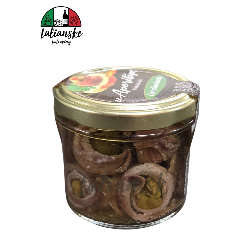 Zloženie: Ančovičky solené (ančovičky, soľ) 38%, slnečnicový olej 38%, plnené olivy 24%, oliva obsahuje (paprika, voda, soľ, zahusťovadlo: alginát sodný, guarová guma, chlorid vápenatý, reg. kyslosti: kys. citrónová),. Može obsahovať: siričitany.