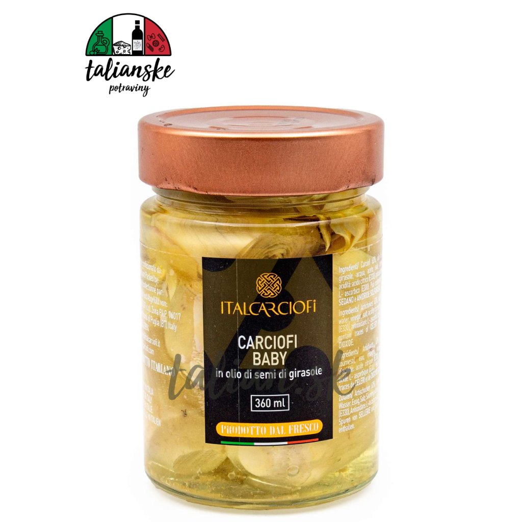 Zloženie: artičoky 63%, slnečnicový olej, voda, ocot, soľ, regulátor kyslosti: kyselina citrónová (E330), antioxidant: kyselina L-askorbová (E300).