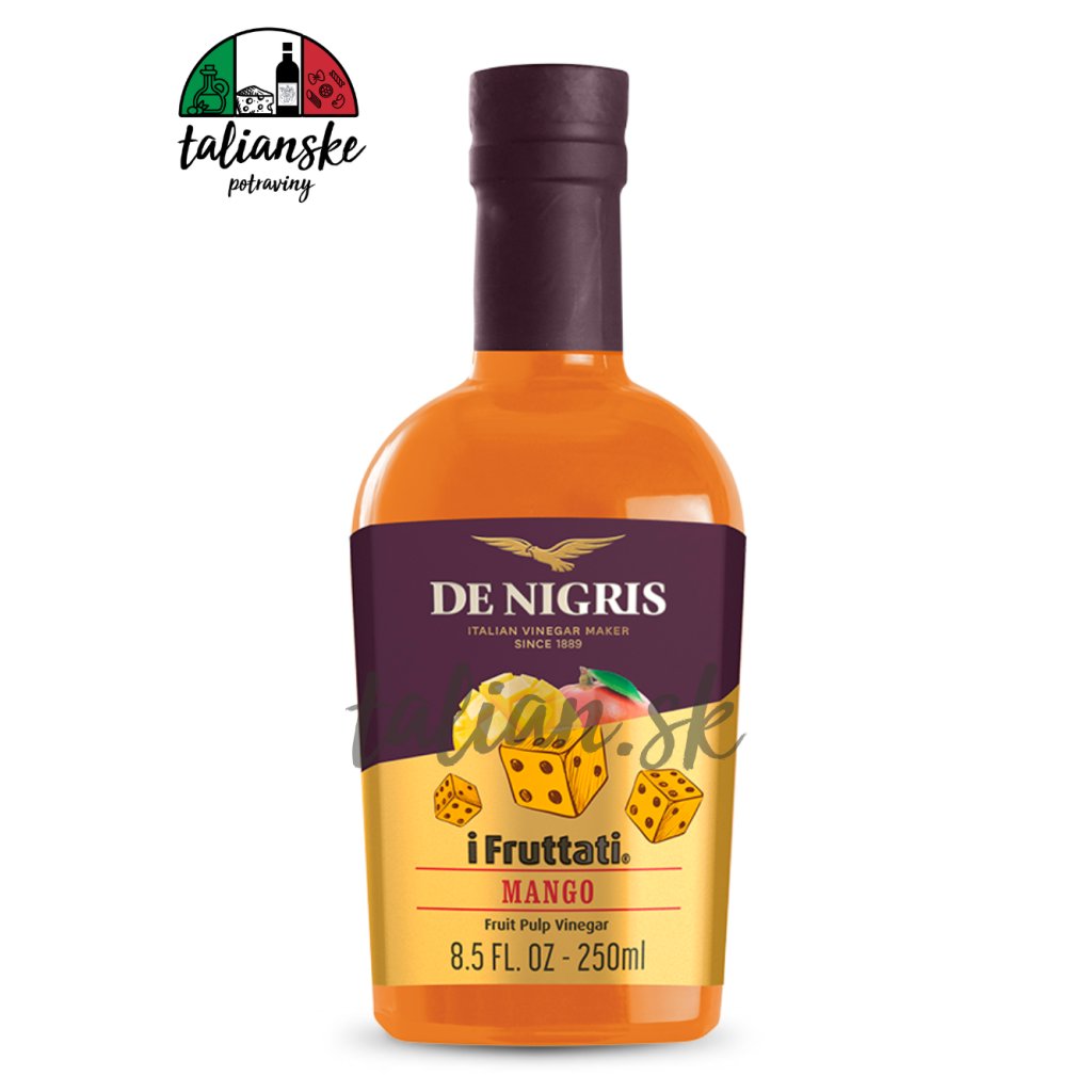 Zloženie: mangové pyré 40%, vínny ocot 30%, koncentrovaný hroznový mušt 29%, jablčný pektín 1%, obsahuje siričitany, kyslosť 4%. Pred použitím pretrepať.