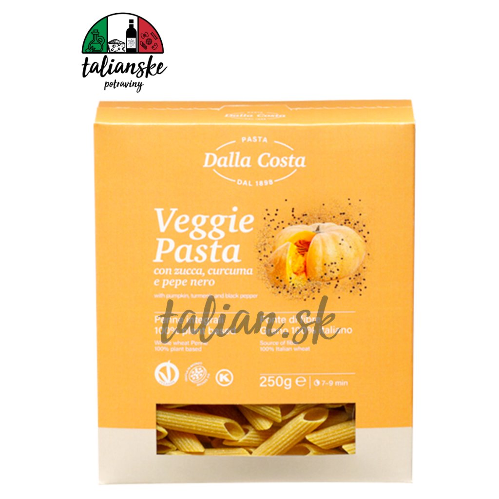 Zloženie: celozrnná semola z tvrdej pšenice 95%, dehydratovaná tekvica 4,2%, dehydratovaná kurkuma 0,5%, čierne korenie 0,3%. Môže obsahovať stopy sóje a horčice.